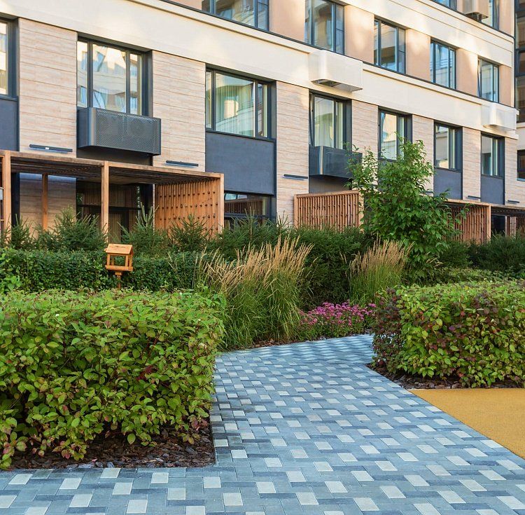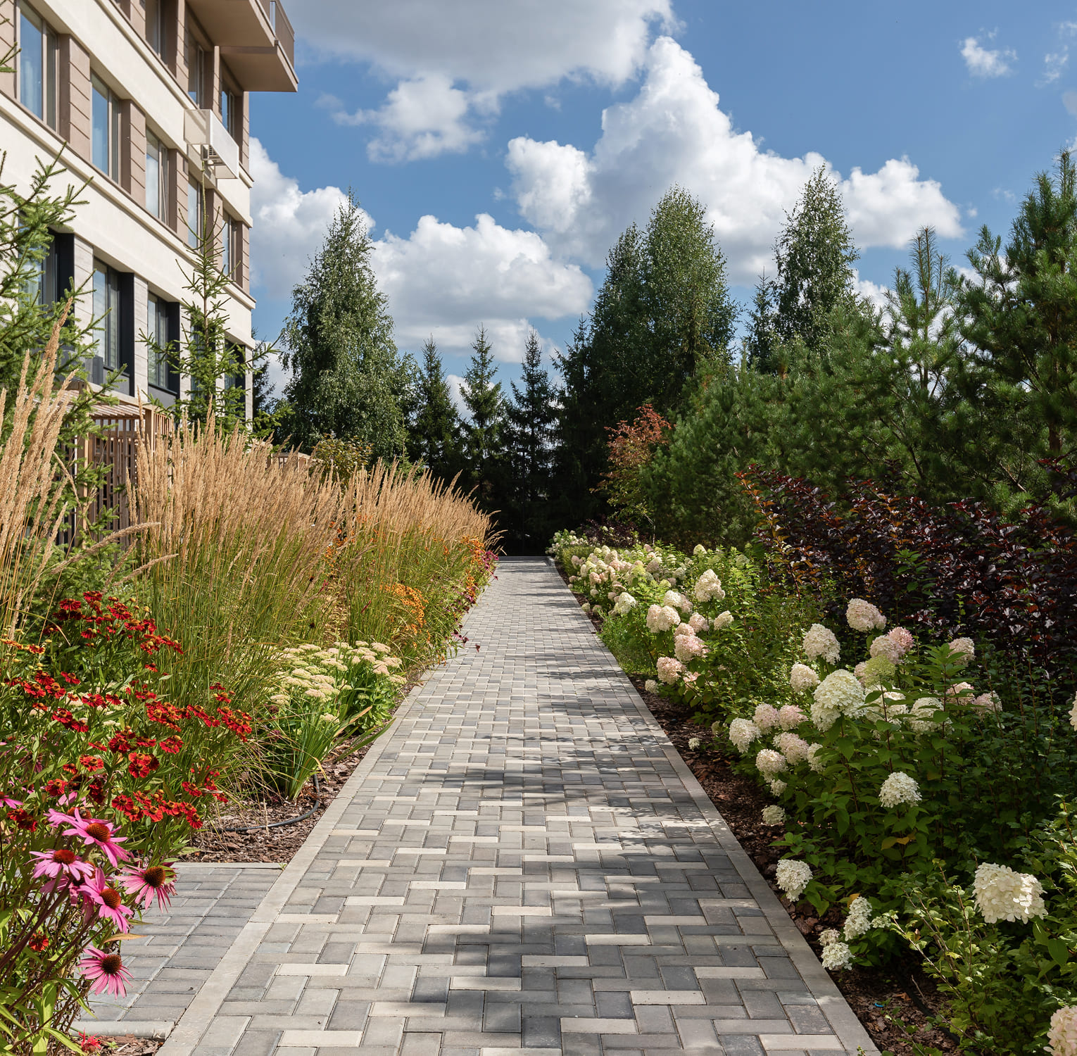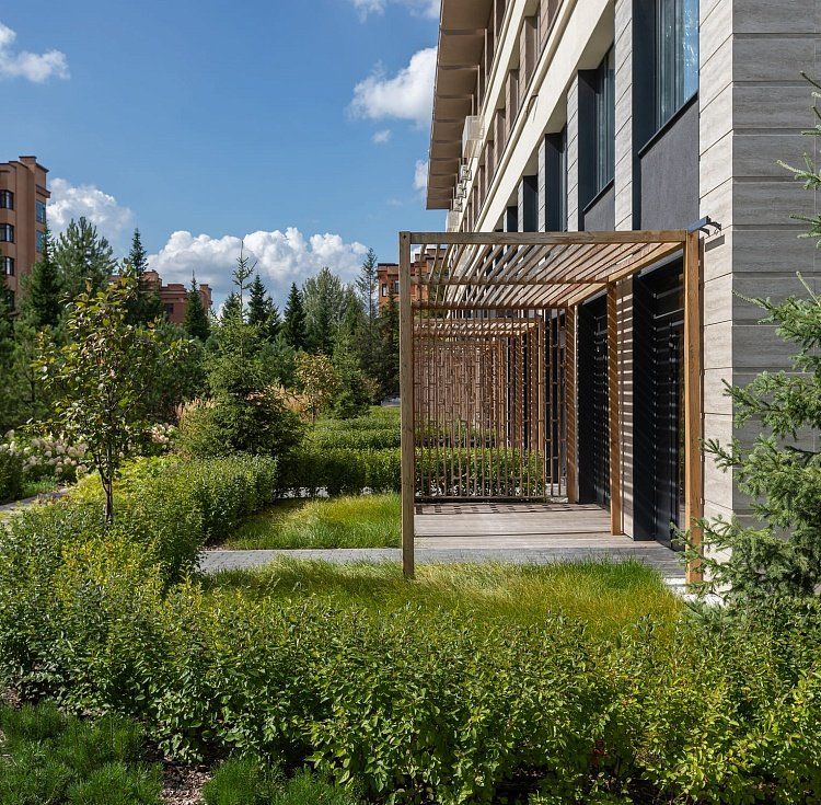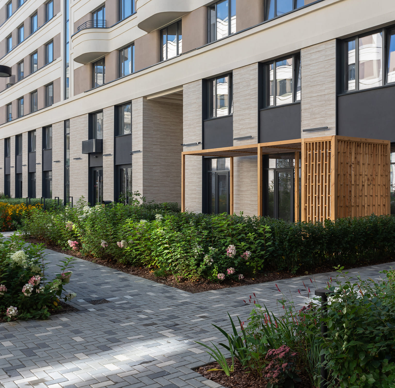 Благоустройство территории предполагает создание приватного двора-парка, где комфорт и функциональность переплетаются с искусством ландшафтного дизайна. Растения подобраны с учетом сезонного цветения — чтобы непрестанно радовать глаз новыми красками. На въезде резидентов и гостей квартала встречает элегантная трехарочная колоннада с пешеходным фонтаном.