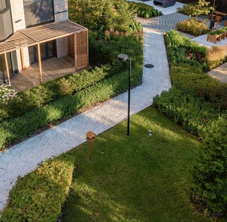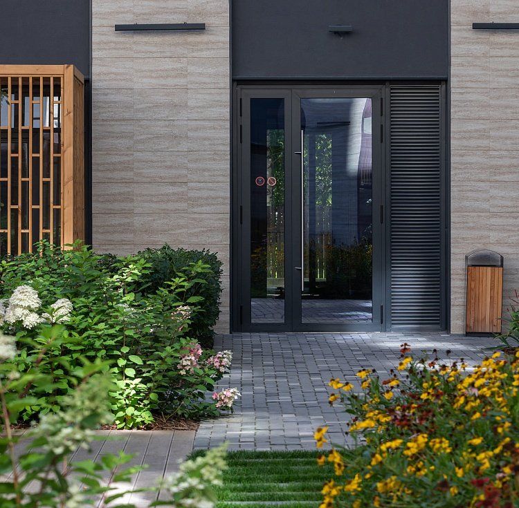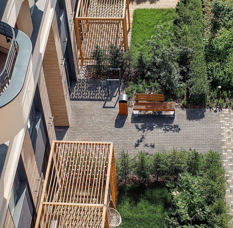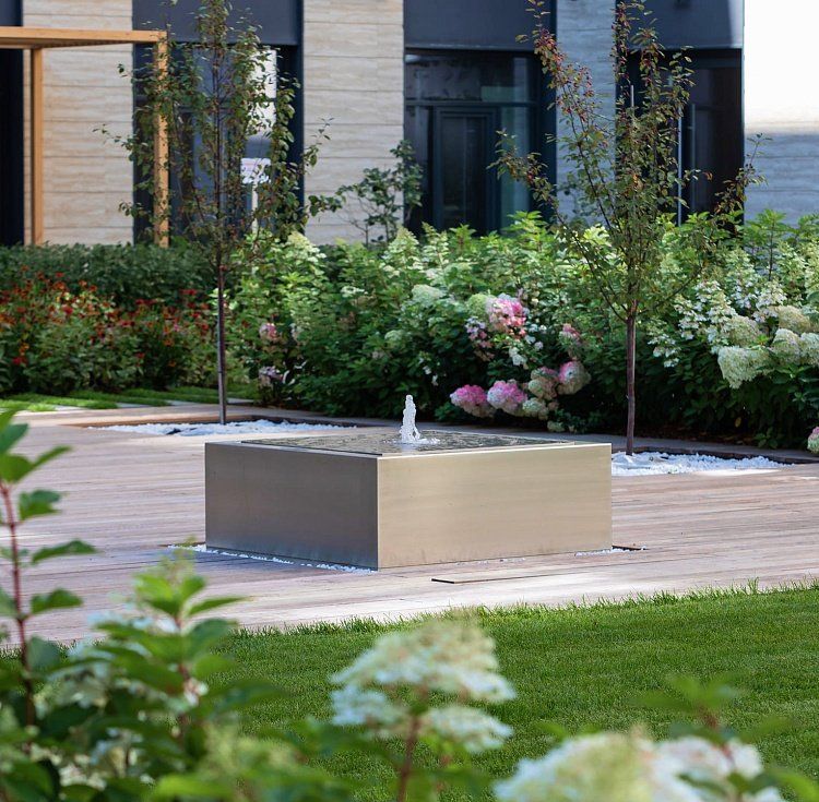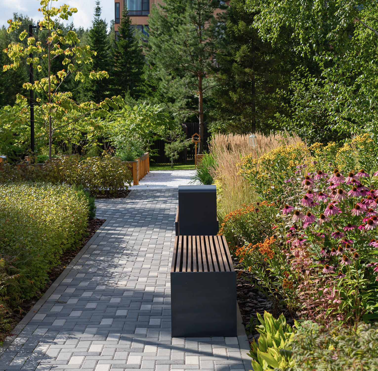 Благоустройство территории предполагает создание приватного двора-парка, где комфорт и функциональность переплетаются с искусством ландшафтного дизайна. Растения подобраны с учетом сезонного цветения — чтобы непрестанно радовать глаз новыми красками. На въезде резидентов и гостей квартала встречает элегантная трехарочная колоннада с пешеходным фонтаном.