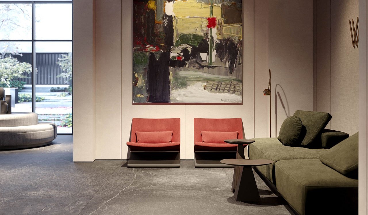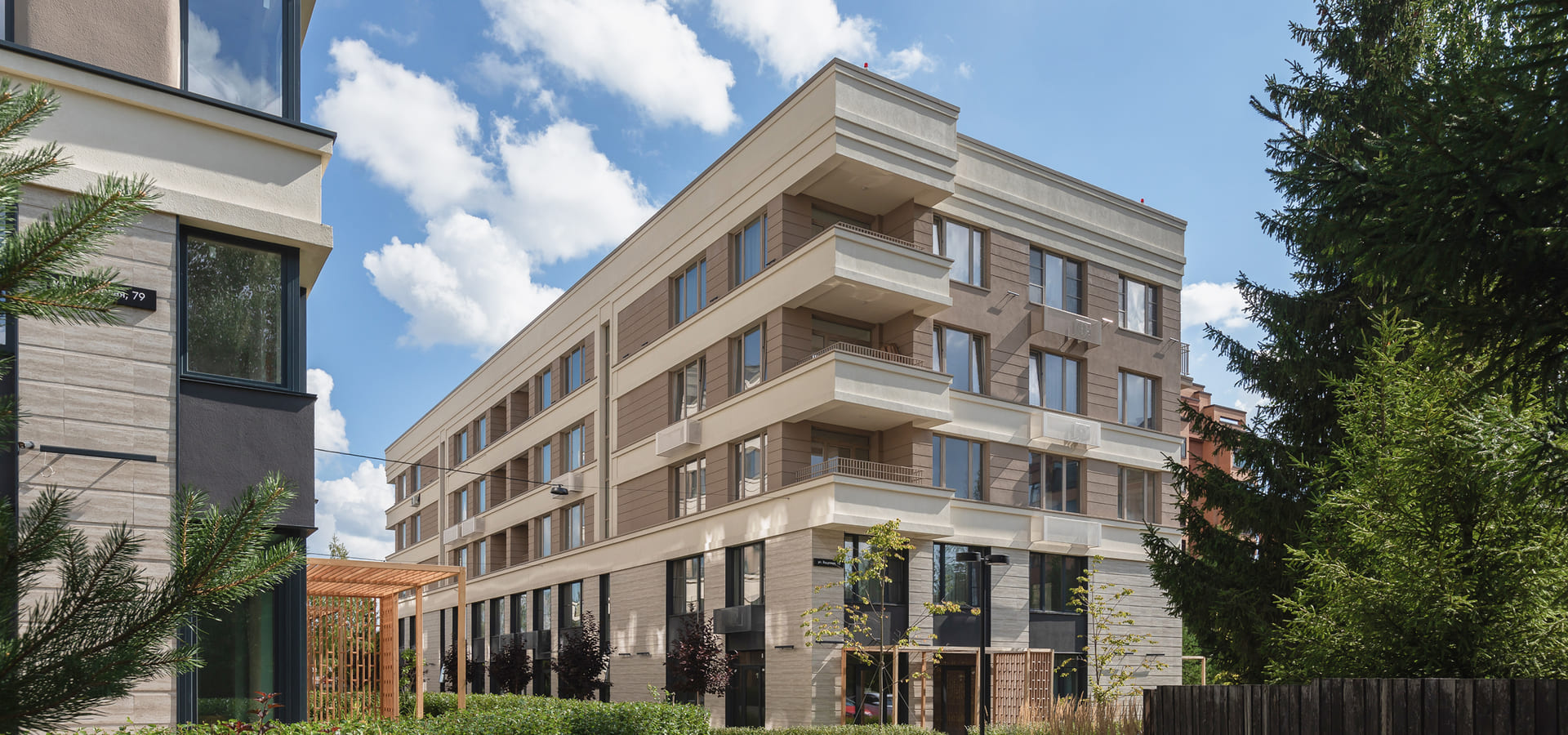 Проект дополняет клубный дом, который находится в самом уединенном месте квартала — в окружении зелени и тишины. Для максимального уровня приватности в нем отсутствуют коммерческие помещения.