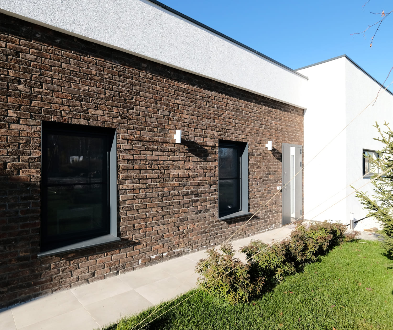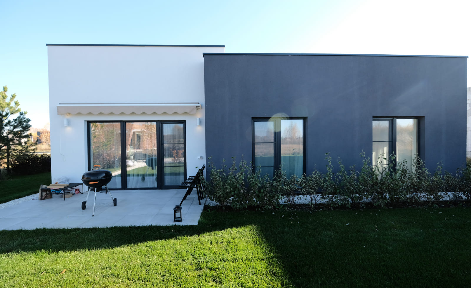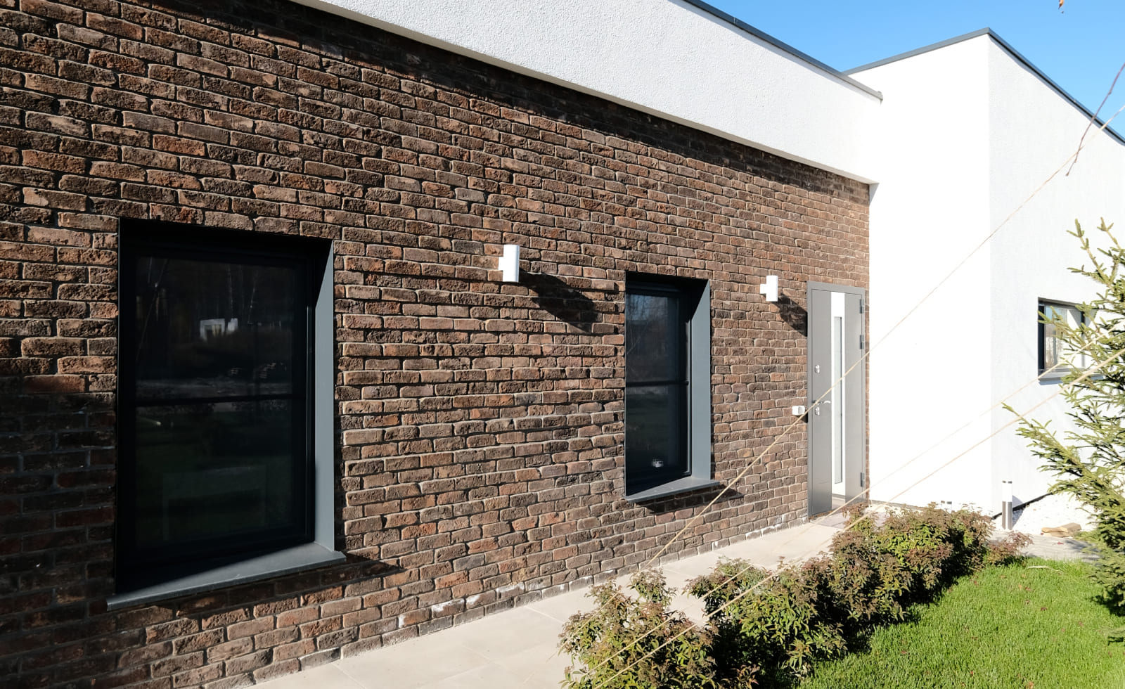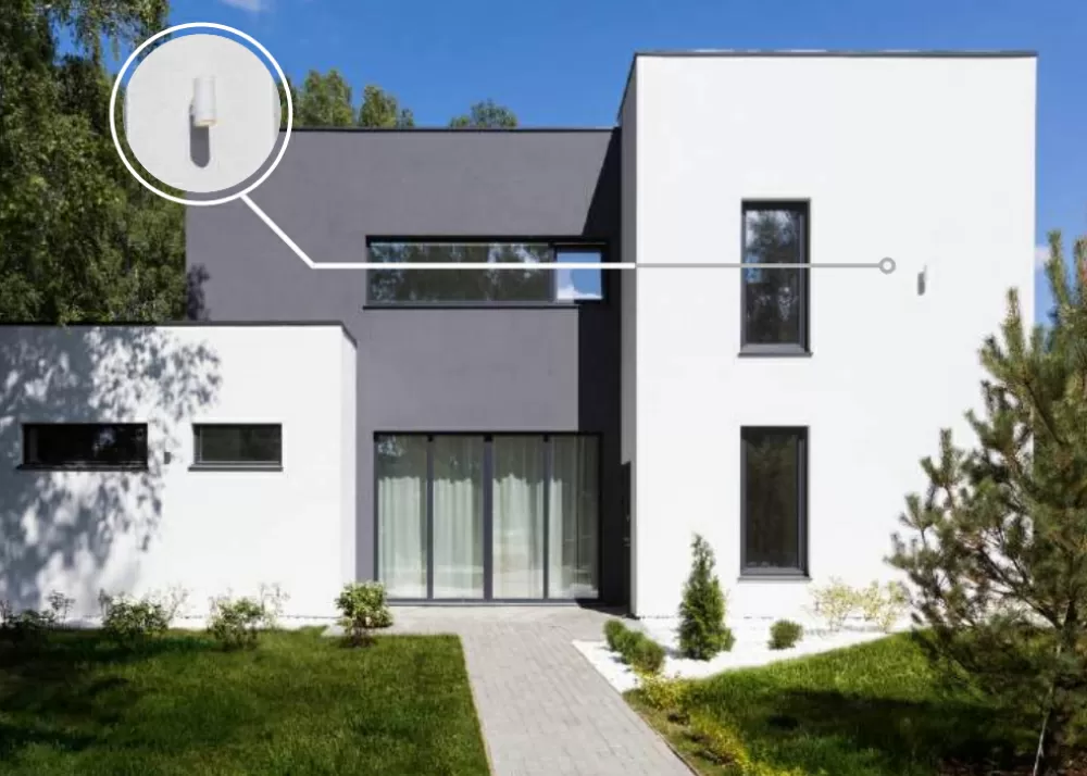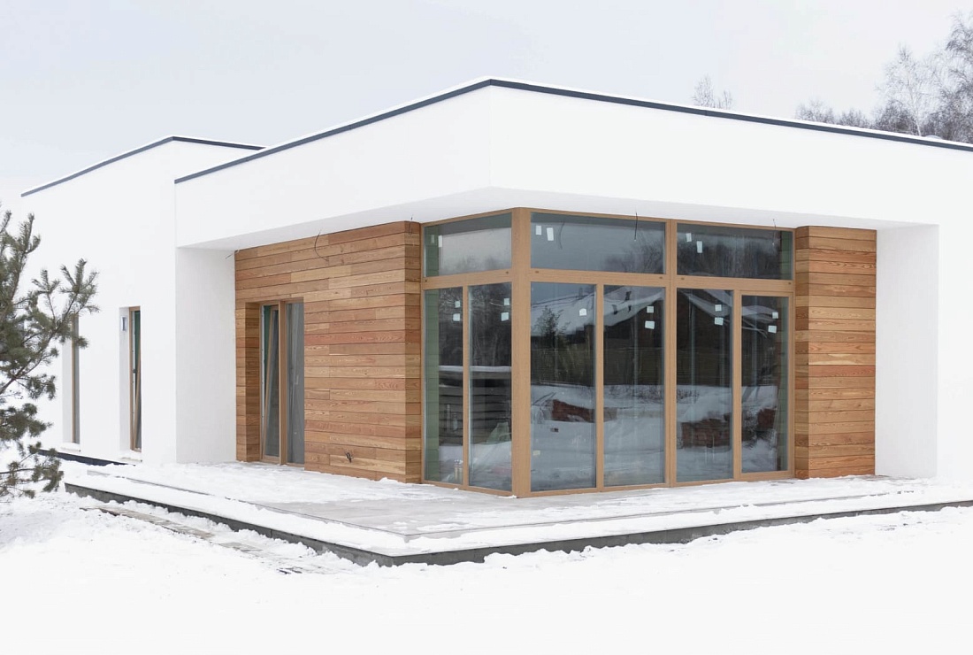 Вечернее освещение подчеркивает текстуры фасадов, создавая мягкий контраст с прохладным воздухом и окутывая ваш загородный дом теплыми оттенками.