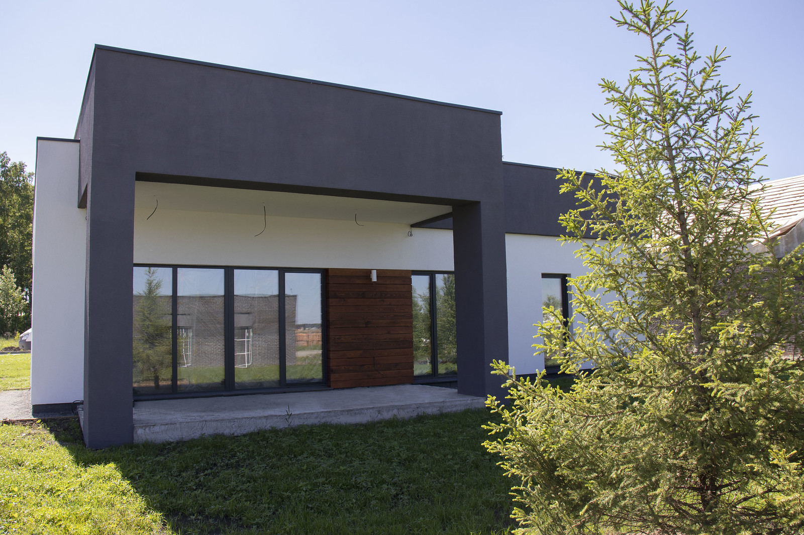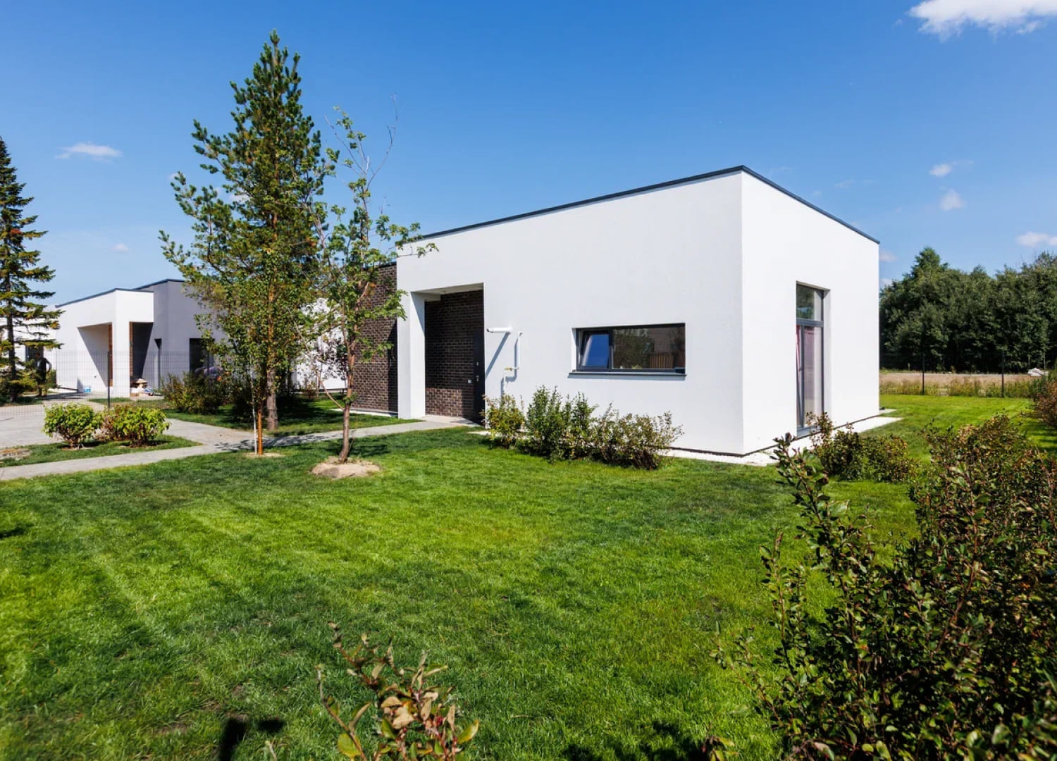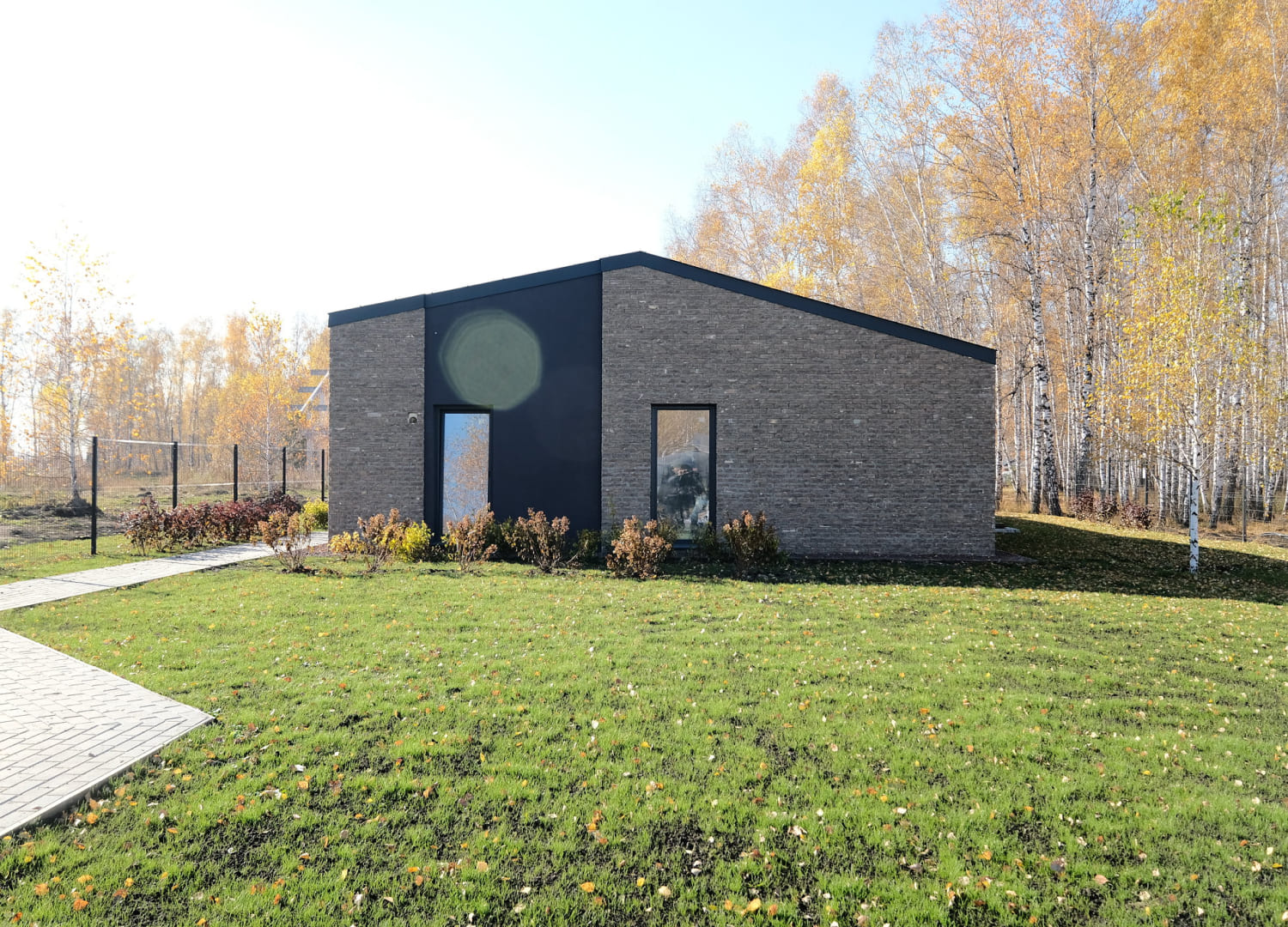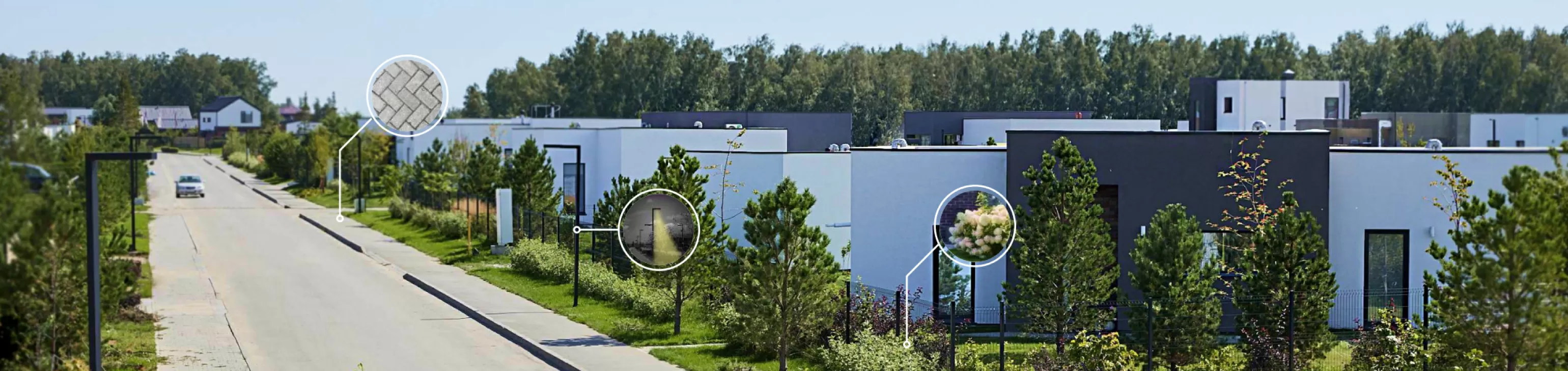Каждый коттедж продается с участком и коммуникациями, скрытыми под землей. На территории уже высажен газон и продумано озеленение кустарниками и крупномерами. Домовладения разделены несплошными ограждениями, которые не создают ощущения изоляции, при этом дают достаточную приватность от соседей.