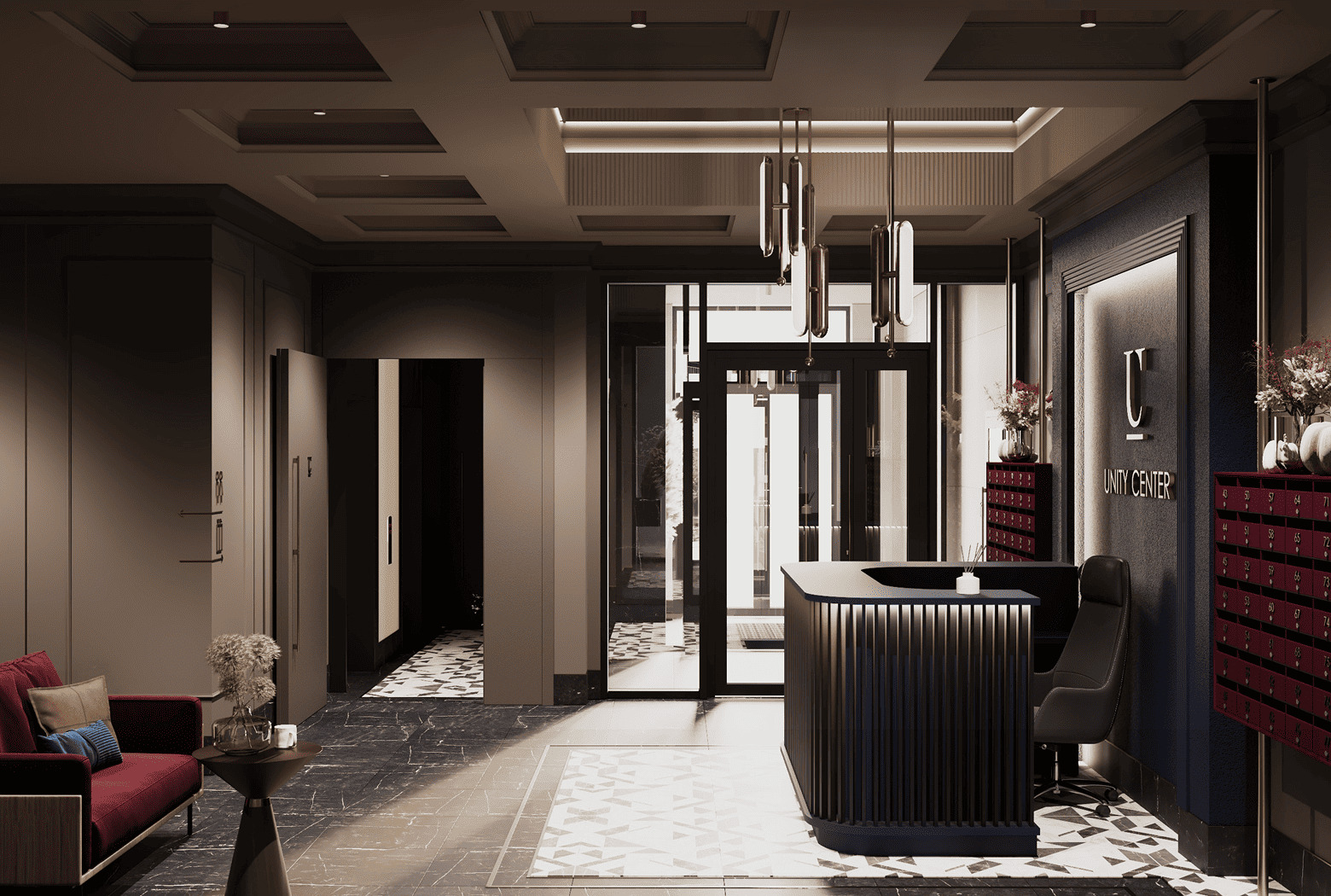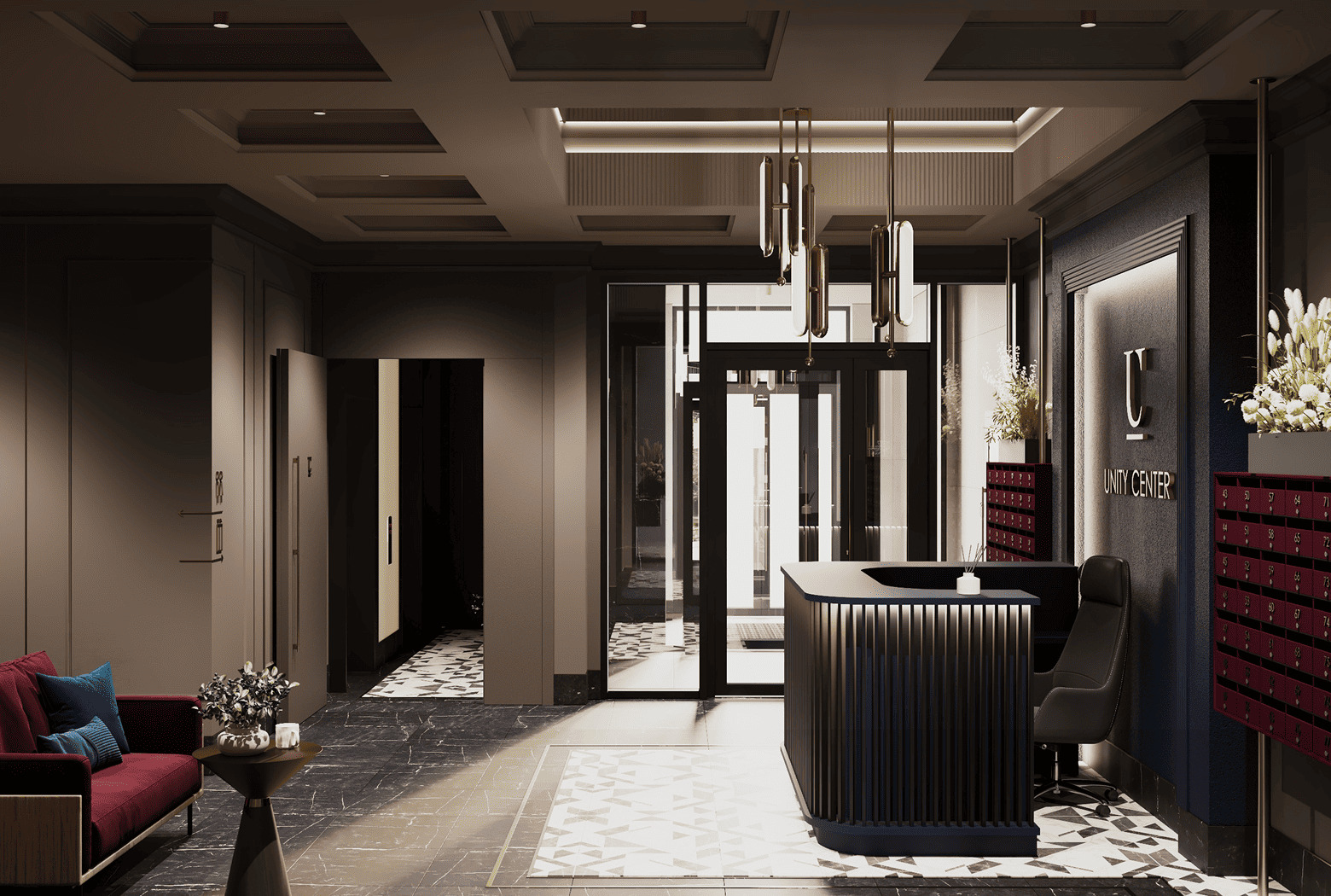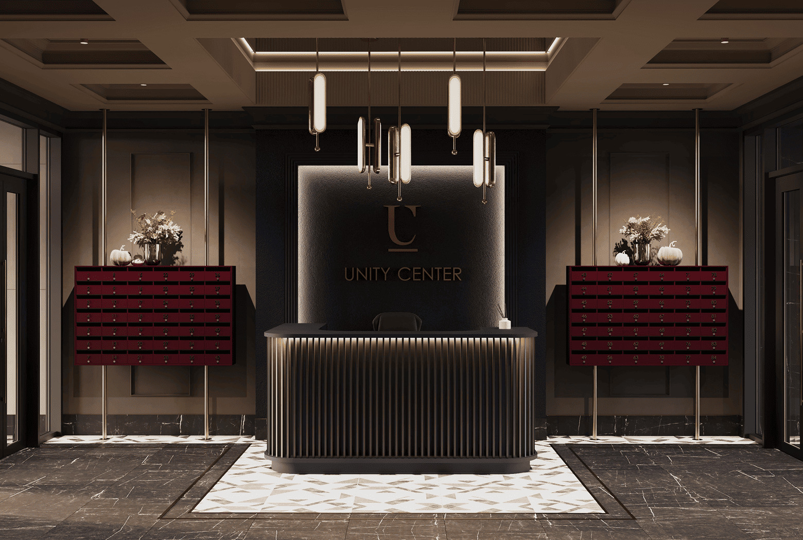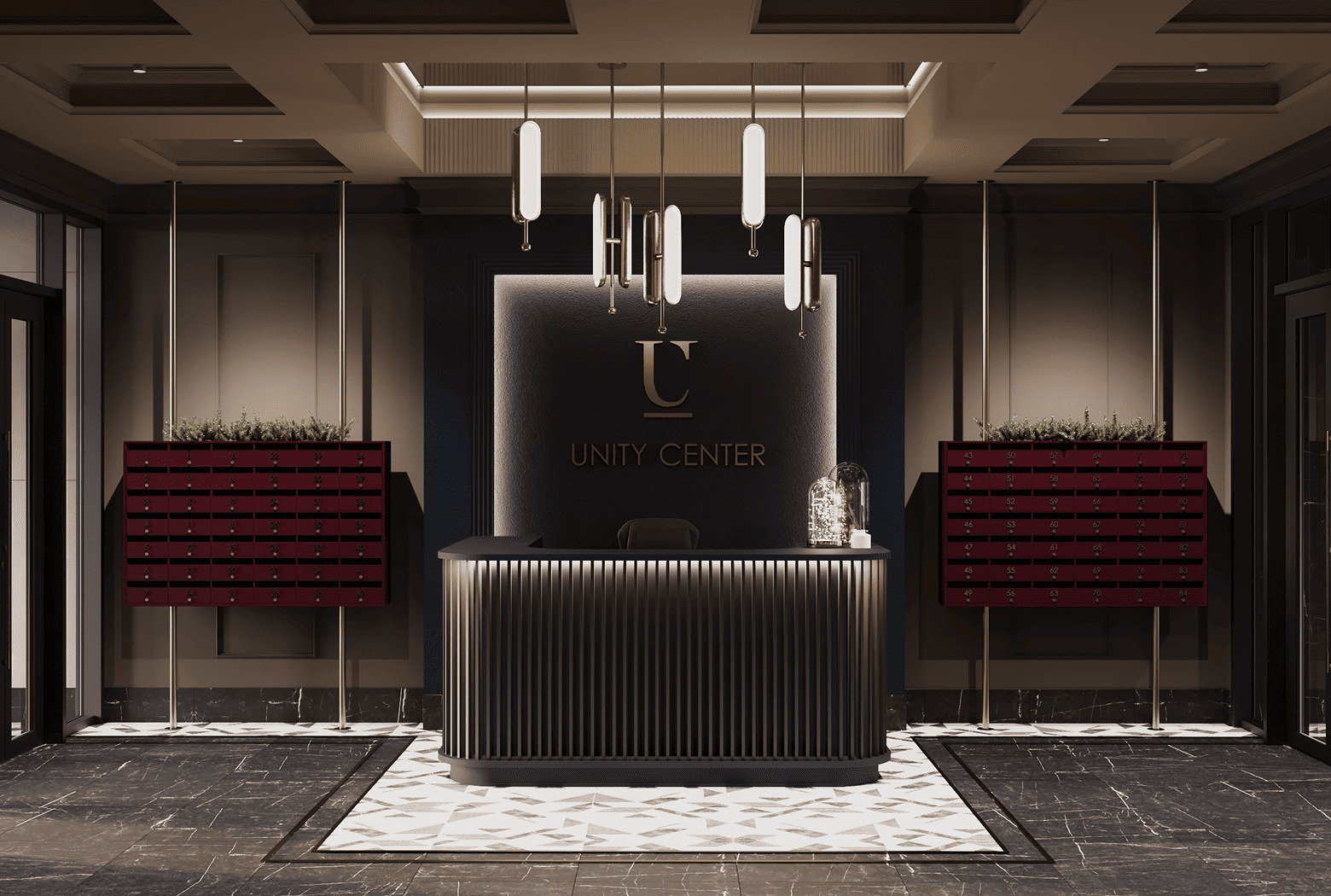 Архитектурная концепция проекта отличается смелыми решениями и выразительным стилем. В фасадах Unity Center — чистые линии, простые формы, спокойные цвета и текстуры, созвучные окружающему урбанистическому ландшафту. Особенностью проекта стало сложное остекление, придающее зданию уникальность и позволяющее обладателям редких квартир реализовать вдохновляющие дизайн-проекты.
